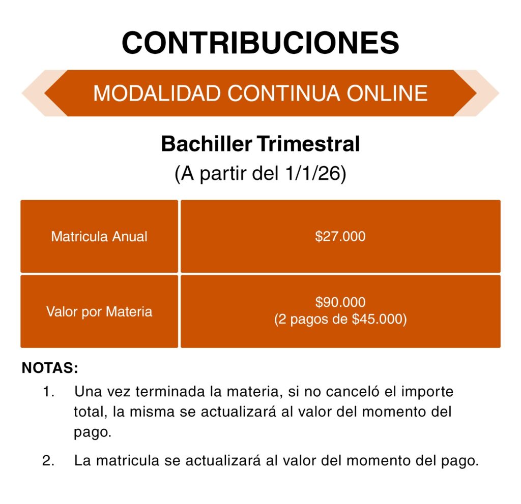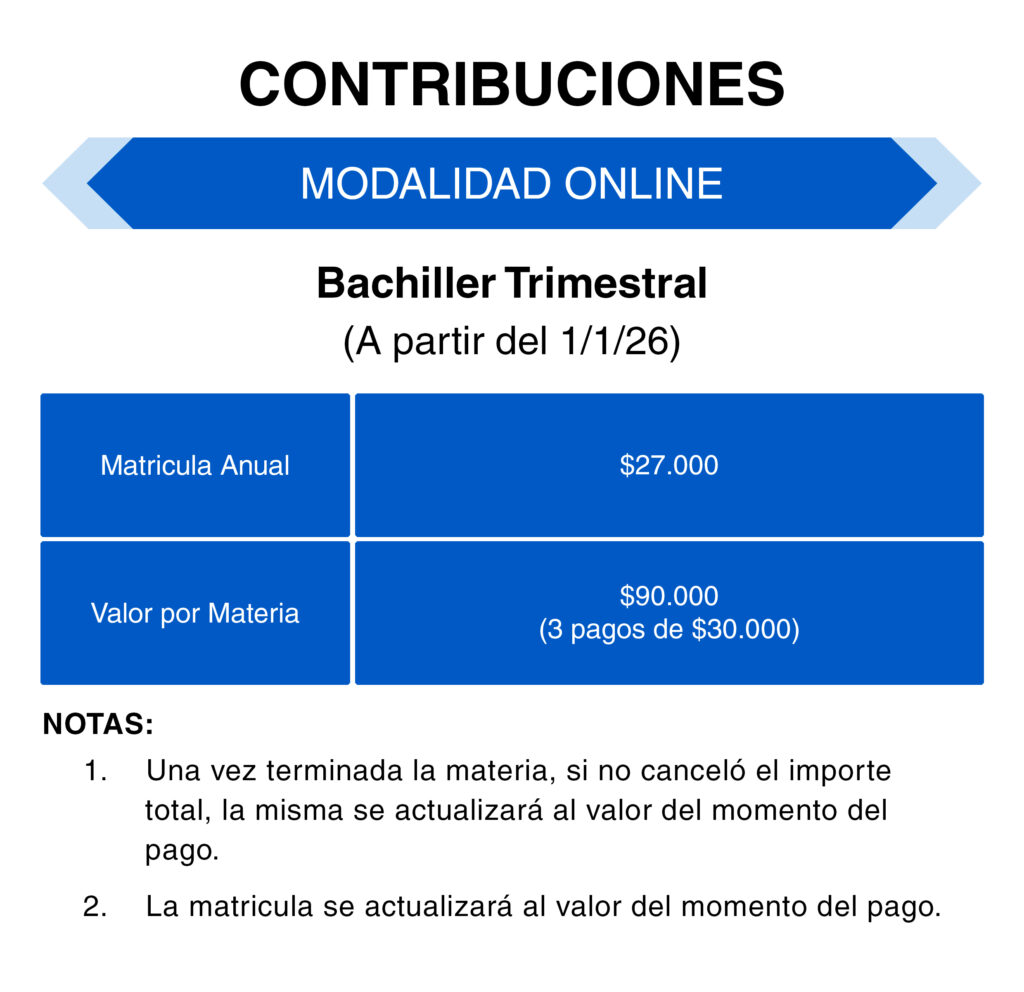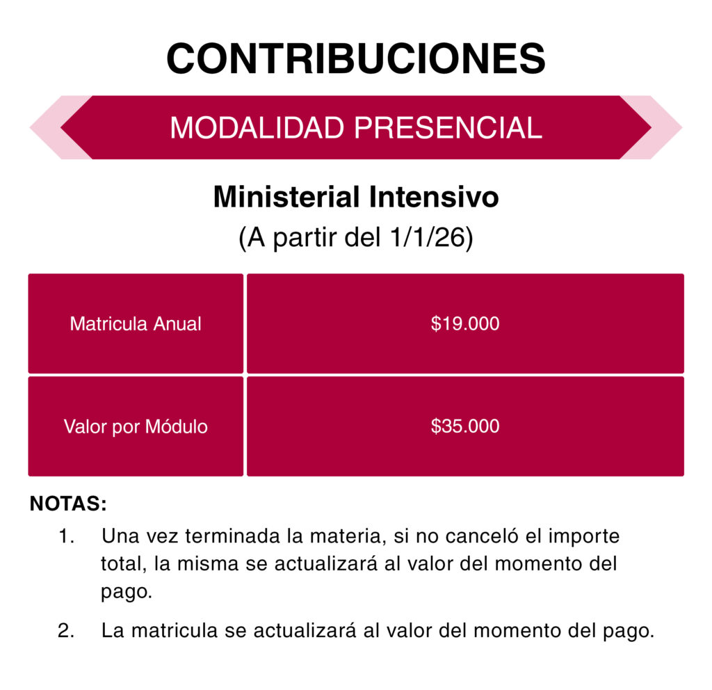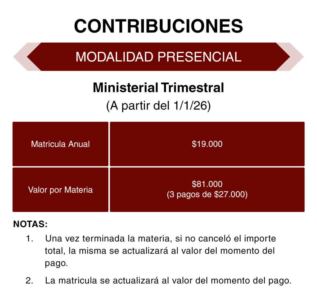 Contribuciones Modalidad Presencial - Bachiller - Trimestral Modalidad Presencial - Bachiller - Intensivo Modalidad Presencial - Ministerial - Trimestral Modalidad Presencial - Ministerial - Intensivo Modalidad Online - Bachiller - Trimestral Modalidad Online - Ministerial - Trimestral Modalidad Continua Online - Bachiller - Trimestral Facebook Instagram Youtube Whatsapp