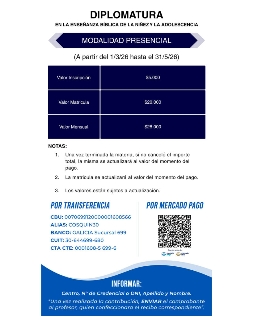 Para INSCRIBIRSE tendrá que abonar el “COSTO DE INSCRIPCIÓN” por transferencia o Mercado Pago.